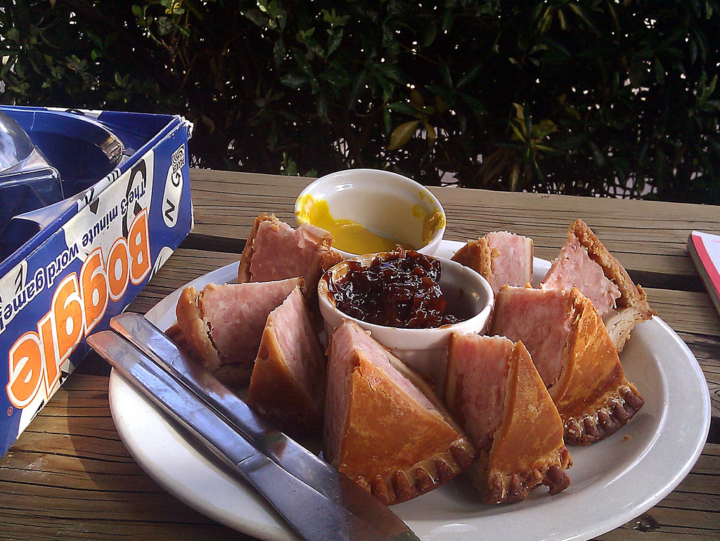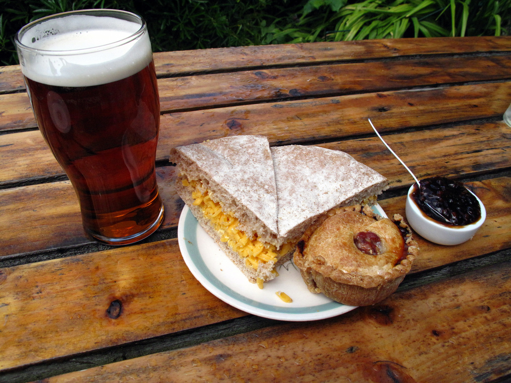 On a sunny day, it’s difficult to beat sitting at a bench in a pub garden and tucking into a ploughman’s lunch and a pint of ale, or a hearty sandwich with pork pie and Branston, or even pork pie on its own with Branston pickle and mustard. Oh yes!